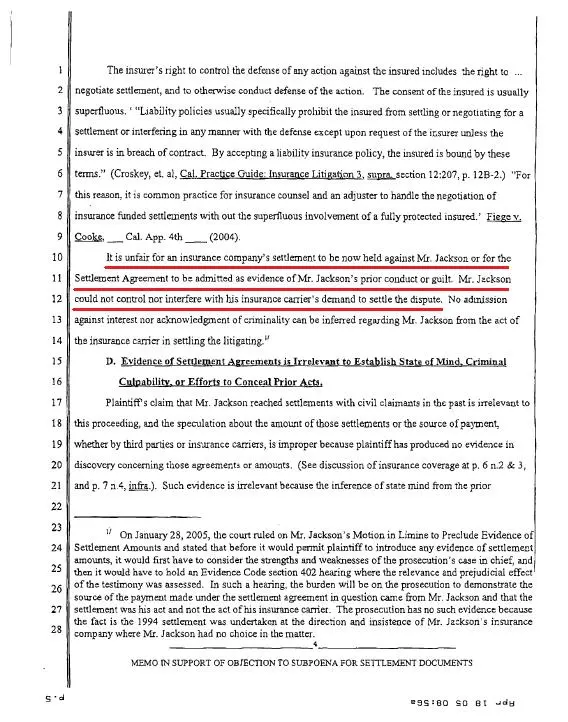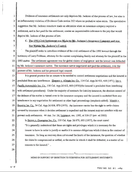 The Oxman memo was the first of its kind to suggest Jackson was forced to pay the Chandlers, that force acted upon him by his insurance company. More specifically, Brian Oxman argued that unless the Prosecution could prove Jackson paid “every dime” of the Settlement Agreement without the nudge of an insurance carrier seeking to override his desire for a trial, it would be dangerously prejudicial for them to introduce the theory of it being proof Jackson had abused Jordie Chandler.