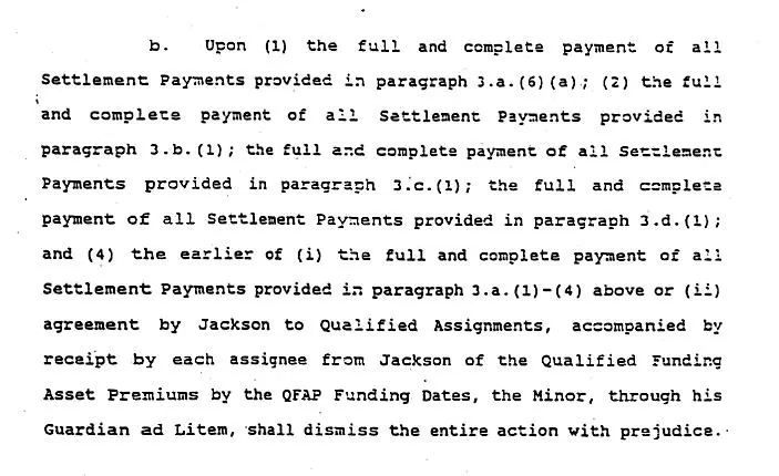 But even more is that upon a completion of all payments, there was the agreement that J. Chandler v. Jackson would be dismissed with prejudice. In other words, Jackson would never have to worry about any of the Chandlers suing him over Jordie Chandler’s 1993 allegations of abuse. Because the settlement payments were spaced so that they would be at lengthy enough intervals as to span the entire criminal statute of limitations, Jackson thereby guaranteed himself that the Chandlers would never become witnesses in a civil or criminal trial against him.